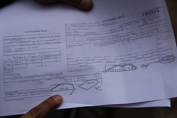 I manifestanti hanno distribuito in fotocopia le loro buste paga. A parità di monte orario mensile col nuovo contratto collettivo applicato da Coopservice le decurtazioni di stipendio toccano anche i 400 euro mesili.