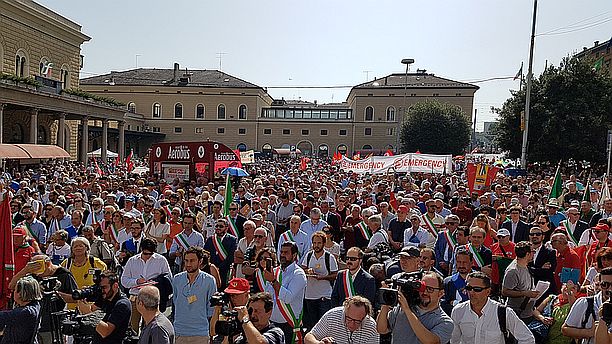 La protesta del Movimento 5 Stelle. Il cortile di Palazzo d’Accursio, sede dell’Amministrazione comunale di Bologna, è stato scelto per la protesta del M5S, dopo l’annuncio del capogruppo in Comune Massimo Bugani di disertare la cerimonia. Bugani stesso e altri attivisti hanno ‘accolto’ i partecipanti, facendosi trovare in mezzo al cortile tutti dietro a un cartello (“Nessun risarcimento per le vittime della Strage di Bologna?”), uno striscione contro Pd e Governo e alcune sagome con disegnati, in modo caricaturale e con un fumetto, Matteo Renzi, Graziano Delrio e Paolo Gentiloni, oltre a Paolo Bolognesi, presidente dell’associazione familiari delle vittime.