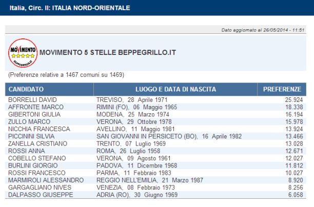Su tutta la circoscrizione il più votato è stato il trevigiano David Borrelli, con 25mila preferenze. Poi Marco Affronte (18mila) e Giulia Gibertoni (16mila). Tra i bolognesi Silvia Piccinini prende 13mila voti di preferenza.