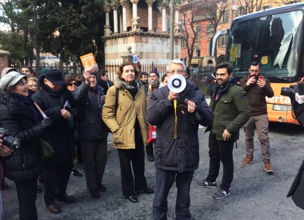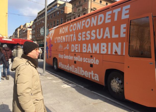 Bologna, 26 feb. – E’ passato anche da Bologna il “Bus delle libertà” con il suo carico di attivsti no gender capitanati dal senatore uscente Carlo Giovanardi. I “no gender”, una ventina circa, si sono autodefiniti “partigiani del terzo millennio” e hanno protestato contro “il diabolico caos” creato da “chi confonde maschi e femmine“. Il bus arancione con la scritta a caratteri cubitali “Non confondete l’identità sessuale dei bambini” si è fermato in Piazza Galvani attorno a mezzogiorno per la sua tappa comunicativa cittadina, una delle tante di un tour che tra le contestazioni sta toccando tutta Italia. Tenuti a distanza da carabinieri e poliziotti in assetto anti sommossa un centinaio di contro manifestanti appartenenti ad Arcigay e ad altri gruppi che a Bologna si occupano della promozione dei diritti civili. “Libertà di identità”, “Alcuni ragazzi amano ragazzi, fattene una ragione”, questi alcuni degli slogan dei tanti cartelli portati in piazza per contestare le idee dei no gender.