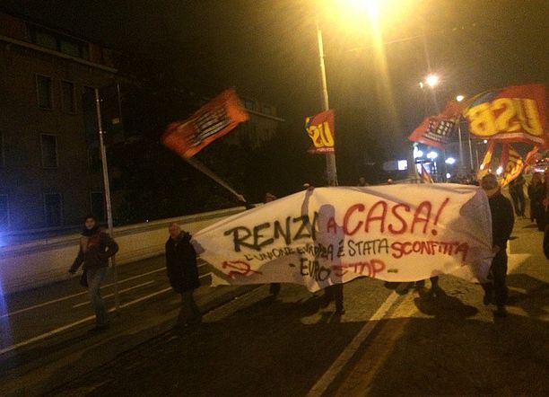 Bologna, 5 dic. – Qualche minuto dopo mezzanotte e mezza sul ponte di via Matteotti a Bologna c’è stato anche chi ha sparato fuochi d’artificio. Perché se in città il ‘sì’ prevale, a festeggiare è il fronte del ‘no’. O almeno festeggiano i cinquanta militanti del sindacato Usb che hanno dato vita ad un corteo improvvisato marciando con in testa lo striscione “Renzi a casa”. Qualche colpo di clacson per le pochissime auto che a quell’ora sono in strada, per il resto nell’aria solo le urla festose e i cori dei sindacalisti di base schierati per il ‘no’. Che evidentemente scelgono di guardare il dato nazionale che dice che Renzi è stato sonoramente sconfitto.