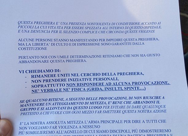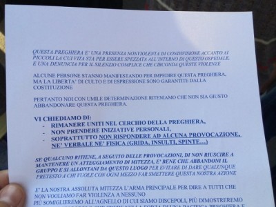 Sveglia all’alba per alcune decine di attiviste femministe, sindacaliste e rappresentanti di Sel e Rifondazione Comunista, per contestare i membri della comunità di don Benzi che ogni martedì, giorno in cui al Sant’Orsola vengono eseguite le interruzioni volontarie di gravidanza, si ritrovano per una veglia di preghiera “per la vita”. Gli antiabortisti, in maggioranza uomini, erano guidati da Enrico Masini, responsabile per la Papa Giovanni XXIII del servizio Maternità Difficile e Vita. In mano avevano rosari, volantini con i testi delle preghiere e un foglio di avvertenze per come fronteggiare le contestazioni.