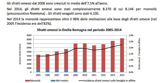 Bologna, 4 apr. – Una famiglia su tre tra quelle che in regione vive in affitto è in condizione di disagio abitativo, il dato preciso dice il 32% rispetto alle 108.200 famiglie che non hanno una casa di proprietà. E ancora: le case popolari sono in tutto 55.000 in regione: non solo molte meno del necessario, ma spesso abitate da persone più ricche di quelle che ne sono escluse. A Bologna i nuclei in gravi difficoltà economiche sono 20.100, che vuol dire il 40% delle famiglie in affitto escludendo quelle nelle case popolari. Infine gli sfratti per morosità in regione avanzano ad un ritmo del 7,5% in più l’anno. Tutti dati emersi dal rapporto “dimensioni e caratteristiche del disagio abitativo in Italia”, presentato oggi e redatto da Nomisma in collaborazione con Federcasa e Anci.