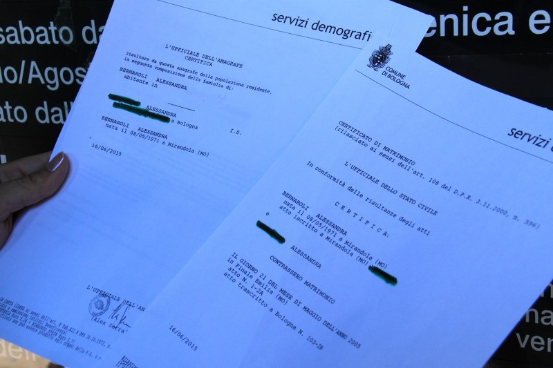 Così lo scorso 13 giugno Alessandra Bernaroli ha ritirato a Finale Emilia, comune in cui si erano celebrate le nozze, l’estratto per riassunto di atto di matrimonio, un atto che serve a dimostrare il luogo e la data di matrimonio, documento che le ha permesso oggi finalmente di ritirare il certificato di matrimonio al Comune di Bologna. La signora Alessandra si dice emozionata, “piena di gioia e soddisfazione” in questa giornata in cui finalmente è riuscita a raggiungere “un traguardo così desiderato e così giusto”.
