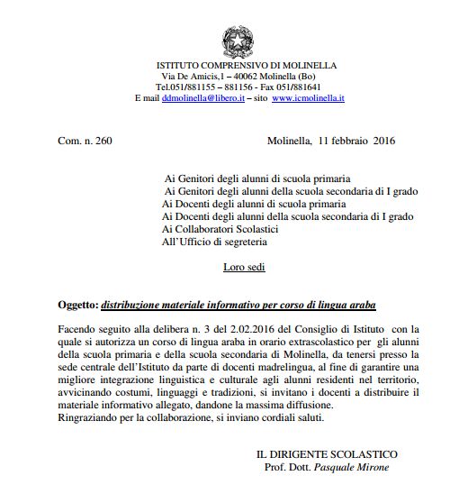 Bologna, 10 mar. – Corsi di arabo alle scuole elementari? La notizia delle lezioni di arabo gratuite (e facoltative) per i bimbi della scuola primaria di Molinella (Bo) ha fatto il giro dei quotidiani nazionali, con tanto di commenti su una presunta ‘integrazione al contrario’. “Non c’è nulla di nuovo o scandaloso in questi corsi”, spiega Arcangela Mastromarco, docente con un’esperienza ventennale nell’insegnamento dell’italiano e responsabile a Milano di una rete dedicata all’insegnamento dell’italiano come seconda lingua.