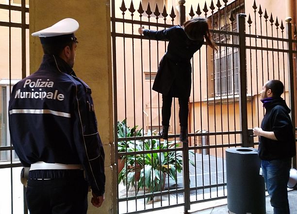 Passa anche il sindaco Virginio Merola: “Dichiarerò quando questa sceneggiata sarà finita”, si limita a dire. Passa qualche altro minuto e la tensione si alza quando una manifestante si arrampica su un cancello nel cortile. Gli agenti ne approfittano per chiudere la cancellata dello scalone che sale al primo piano, per impedire che potessero risalire gli attivisti sopraggiunti per dar man forte alla ragazza. Finisce con urla e spintoni, perché i manifestanti cercano di impedire la chiusura del cancello: tra gli agenti c’è in azione anche il comandante della Polizia municipale, Carlo Di Palma, che nella concitazione finisce per terra. I cronisti vengono di nuovo allontanati da un agente della Questura in borghese, anche con una leggera spinta. Nello stesso punto, subito dopo, viene schierato un cordone di poliziotti con gli scudi.