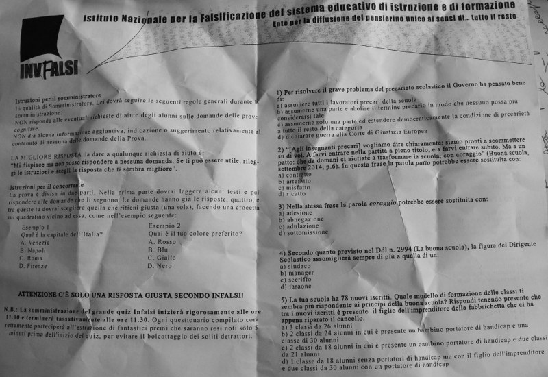 A una “studentessa” in carrozzina che strilla viene chiesto di allontanarsi dall’aula, come previsto da un “terrificante documento emanato da INVALSI”, spiegano nel volantino distribuito in piazza, che chiede di indicare nella prova se il bambino soffre di patologie come DSA, handicap, dislessia o altro per poter escludere i loro risultati dall’elaborazione dei dati e chiede di esser certi che se in classe non disturbino il protocollo di somministrazione visto che non è ammessa la presenza di insegnanti di sostegno, o altrimenti di non farli partecipare alla prova.