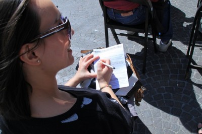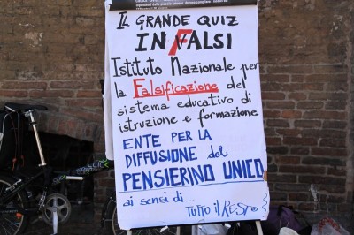 Bologna, 12 mag.- Una ventina di studenti stamattina hanno sottoposto a genitori, insegnanti in sciopero e passanti “Il grande quiz InFalsi”, una versione ironica dei tanto criticati test Invalsi, ricreando un’aula a cielo aperto in Piazza Re Enzo.