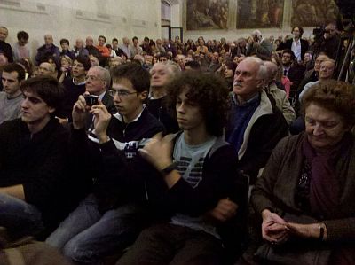 Nel pubblico alcuni giovanissimi ma anche tanti e tante non più di “primo pelo“, che invocano il suo nome, cercano l’autografo e intervengono a voce alta durante il monologo per assicurare al rottamatore che “il tam tam” che chiede per poter vincere” è già partito”. Alcune voci voci