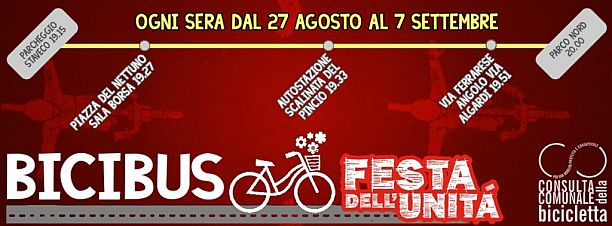 L’appuntamento per tutti è alle 19.15 al Parcheggio Staveco. Da lì partirà “bicibus che attraversa tutta la città per arrivare, giusto in tempo per l’ora di cena, alla Festa dell’Unità, con fermate in Piazza Maggiore, Autostazione, Piazza dell’Unità e altre fermate intermedie”.