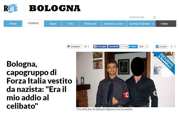 Bologna, 2 mag. – Galeazzo Bignami travestito da nazista. Sono le foto, pubblicate da Repubblica Bologna, che stanno facendo il giro del web. Le due immagini mostrano il capogruppo di Forza Italia in regione vestito da nazista, con camicia nera e fascia con svastica sul braccio. Accanto a lui un uomo col volto oscurato e con, sempre sul braccio, l’inequivocabile simbolo delle SS hitleriane. Una seconda foto invece mostra Bignami di profilo, e sulla parete le bandiere della Germania nazista e del fascismo. Bignami si è difeso, parlando di “goliardata” di 10 anni fa durante una festa, la sua, di addio al celibato. “Non mi maschero spesso, né partecipo nella maniera più assoluta a feste old style. Ricordo bene l’occasione in cui sono state scattate quelle foto. Si tratta della mia festa di addio al celibato”, ha spiegato l’esponente di Forza Italia che comunque non hai mai nascosto di essere un “uomo di destra fatto e finito“.