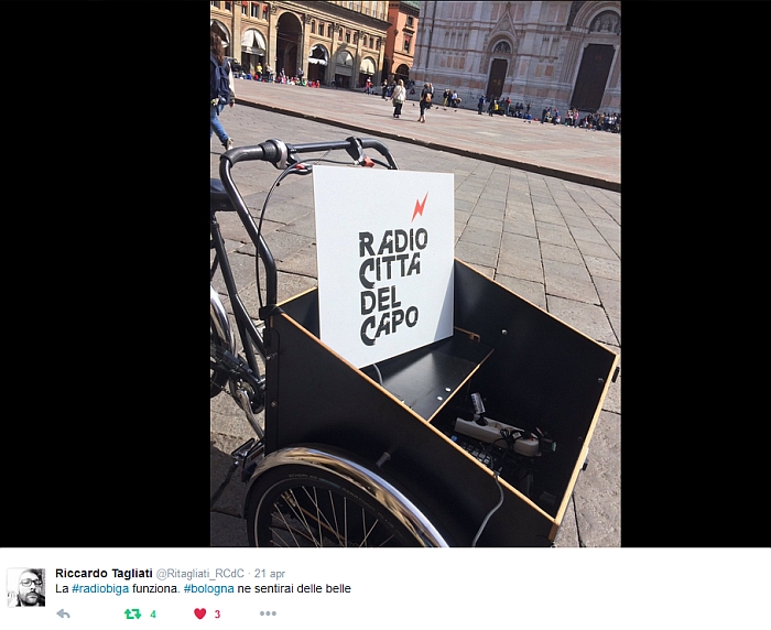 Radio Città del Capo racconterà in diretta il Bike Pride dalle 16.30 alle 17.30. Sarà una trasmissione speciale perchè sarà anche l’esordio della radiobiga, uno studio mobile su due ruote con cui promettiamo di raccontare altri eventi cittadini. In sella alla radiobiga sentirete Riccardo Tagliati mescolato alla folla in bicicletta.