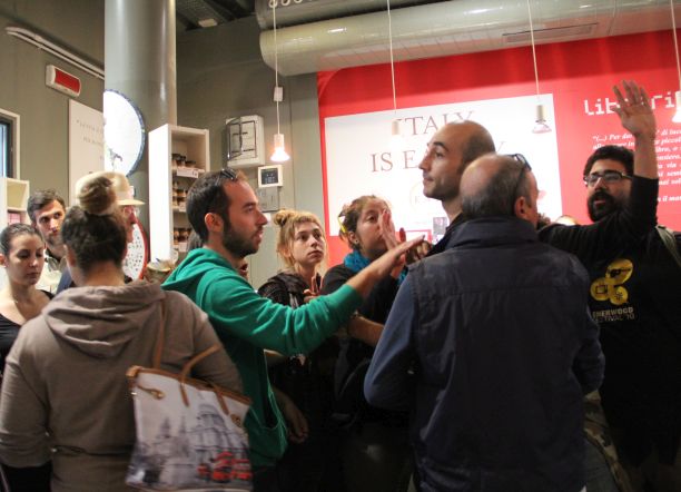 Bologna, 3 set. – Incursione al punto vendita Eataly di Bologna, in via degli Orefici. “Siamo qui per svelare quello che si nasconde dietro al modello Eataly”, hanno spiegato i manifestanti, una trentina in tutto, che si sono presentati nel centro commerciale attorno alle 17.30 distribuendo volantini firmati “La foglia di Fico“.