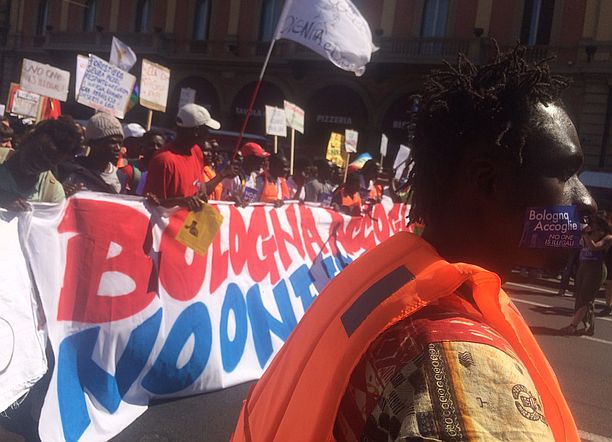 Un minuto di silenzio in piazza Maggiore a Bologna per tutte le persone che sono morte “in mare, nel deserto o nelle prigioni libiche”, nel tentativo di attraversare il Mediterraneo. Si è chiuso così il corteo “No one is illegal” che questo pomeriggio ha portato in corteo migliaia di persone per le strade del centro cittadino. Partita intorno alle 15.30 da piazza XX settembre, la manifestazione ha sfilato sul viale davanti alla stazione di Bologna, bloccando il traffico. Poi, percorrendo via Amendola, piazza dei Martiri, via Irnerio e via Indipendenza, il corteo e’ arrivato in piazza Maggiore. Secondo gli organizzatori la manifestazione ha superato le settemila presenze.