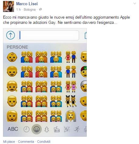 Bologna, 28 apr. – La tecnologia, si sa, corre veloce ed è sempre al passo dei tempi. A quanto pare anche sui diritti civili, se è vero che un colosso dell’informatica come Apple ha aggiornato le ”emoticon” dei suoi sistemi operativi aggiungendo le figure stilizzate di due coppie gay (uomo-uomo e donna-donna) con figli. La cosa però non è andata giù a Marco Lisei, consigliere comunale di Forza Italia a Bologna, che è stato tentato addirittura di cambiare smartphone, tablet e computer e passare alla concorrenza. Ma “la coerenza si scontra col portafoglio”, scrive Lisei sul suo profilo Facebook.