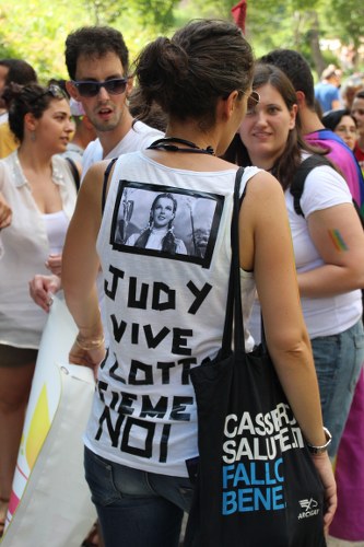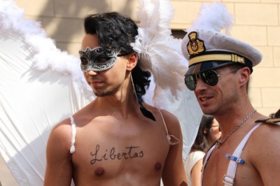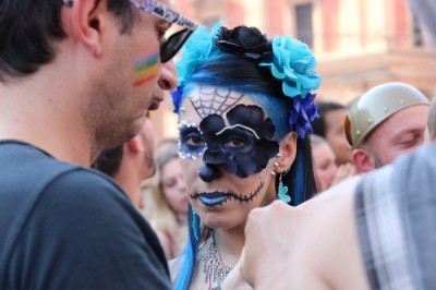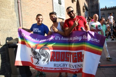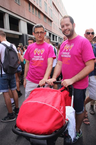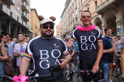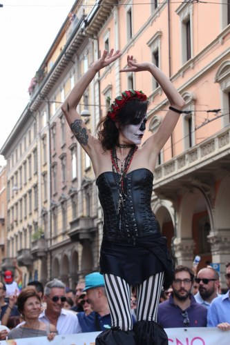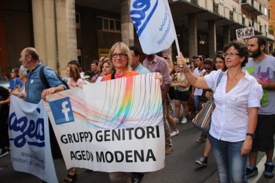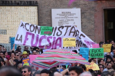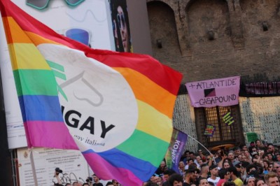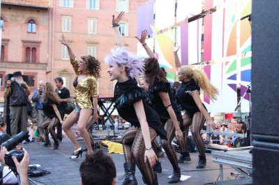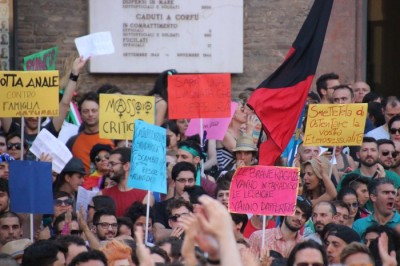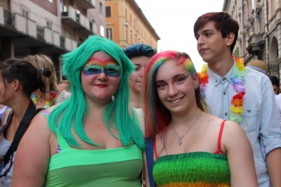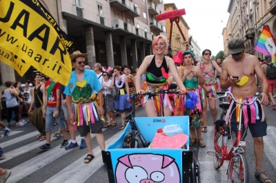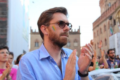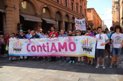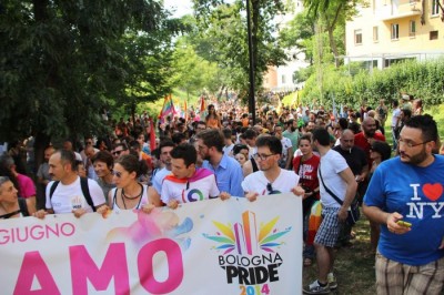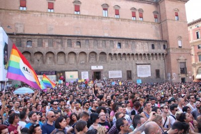 Sotto il palco una piazza del Nettuno gremita e variopinta, ventimila persone secondo gli organizzatori. C’era la parte più colorata con i costumi, gli unicorni arcobaleno, gli angeli e le figure mitologiche con i trampoli, ma c’erano anche le famiglie, i bambini, molti genitori, moltissimi giovani delle scuole superiori e dell’università, delegazioni consistenti da Modena e da Pistoia. Lo striscione di apertura recitava “ContiAmo” e dietro solo un furgone, elettrico, ma con la musica altissima, dance, anni ’80 ma anche Articolo31 e i Rolling Stone. In prima fila c’erano insieme a Branà la presidente del Mit Porpora Marcasciano, l’assessore comunale Matteo Lepore, il consigliere comunale Pd Benedetto Zacchiroli, la capogruppo di Sel in Comune, Cathy La Torre, il consigliere regionale Franco Grillini, storico leader del movimento omosessuale, e il presidente dell’Arci di Bologna, Stefano Brugnara. Il senatore Sergio Logiudice ha sfilato con la maglia delle Famiglie arcobaleno, insieme al marito e al figlio appena arrivato dagli Stati Uniti.