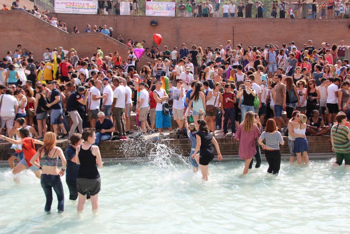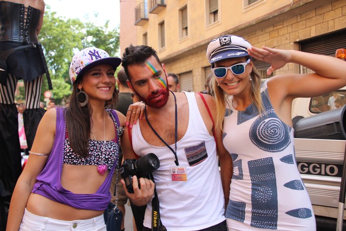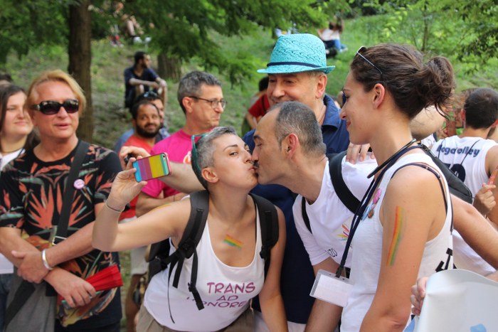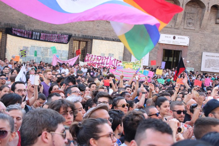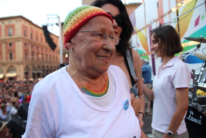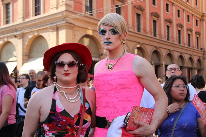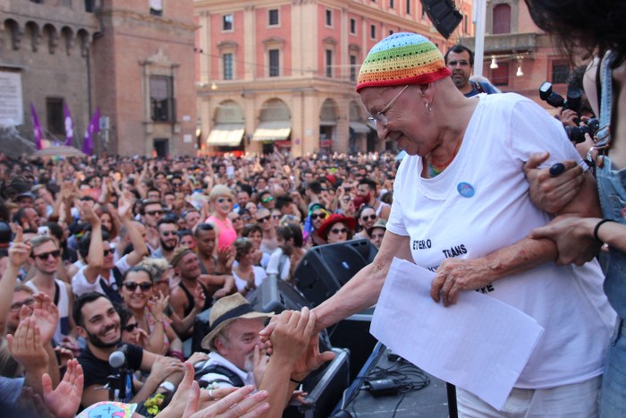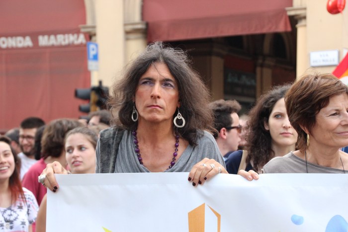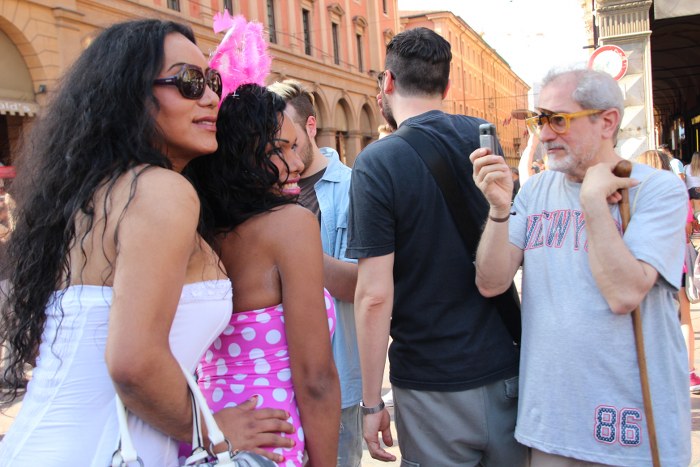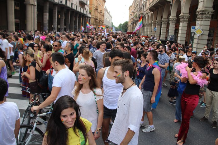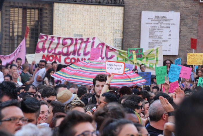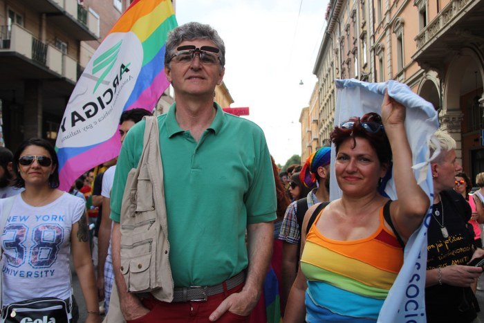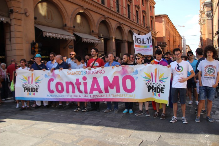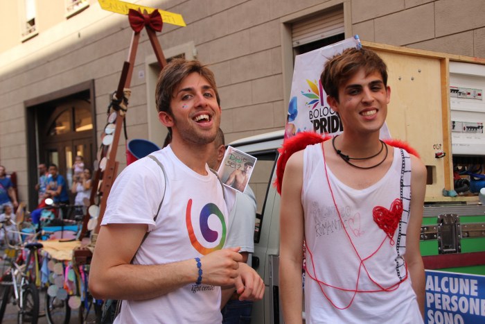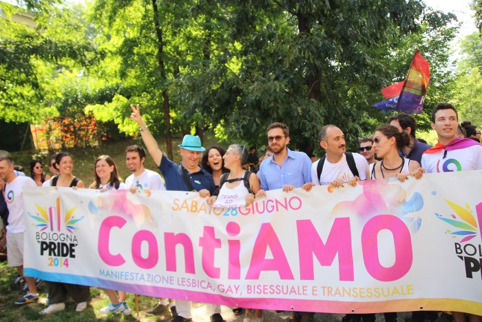 Sotto il palco una piazza del Nettuno gremita e variopinta, ventimila persone secondo gli organizzatori. C’era la parte più colorata con i costumi, gli unicorni arcobaleno, gli angeli e le figure mitologiche con i trampoli, ma c’erano anche le famiglie, i bambini, molti genitori, moltissimi giovani delle scuole superiori e dell’università, delegazioni consistenti da Modena e da Pistoia. Lo striscione di apertura recitava “ContiAmo” e dietro solo un furgone, elettrico, ma con la musica altissima, dance, anni ’80 ma anche Articolo31 e i Rolling Stone. In prima fila c’erano insieme a Branà la presidente del Mit Porpora Marcasciano, l’assessore comunale Matteo Lepore, il consigliere comunale Pd Benedetto Zacchiroli, la capogruppo di Sel in Comune, Cathy La Torre, il consigliere regionale Franco Grillini, storico leader del movimento omosessuale, e il presidente dell’Arci di Bologna, Stefano Brugnara. Il senatore Sergio Logiudice ha sfilato con la maglia delle Famiglie arcobaleno, insieme al marito e al figlio appena arrivato dagli Stati Uniti.
