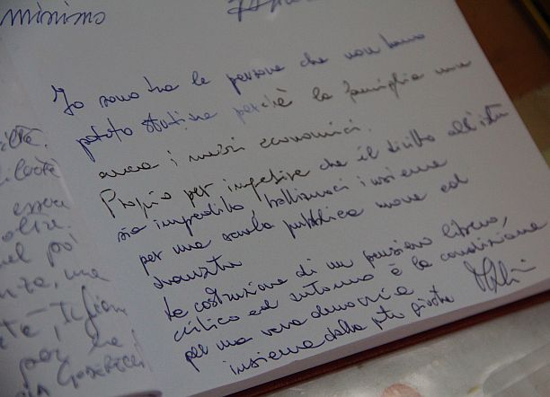 Stamattina al presidio è passato anche il segretario della Fiom Cgil Maurizio Landini, che sul librone di testimonianze che ora verrà portato a Ferrara ha voluto lasciare un suo ricordo: “Io sono tra le persone che non hanno potuto studiare perché la mia famiglia non aveva i mezzi economici. Proprio per impedire che il diritto all’istruzione sia impedito battiamoci insieme per una scuola pubblica”.