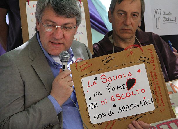 Bologna, 13 giu. – Lo sciopero della fame contro il disegno di legge Buona scuola, in discussione al Senato, a Bologna si conclude domenica 14 giugno, ma la staffetta passa a Ferrara, dove si parte lunedì 15 giugno. La protesta promossa da insegnanti, genitori e studenti nel capoluogo emiliano-romagnolo si sta diffondendo in altre regioni e Bologna rilancia con una nuova forma di presidio, un’ora al giorno davanti all’Ufficio scolastico regionale (a Bologna in piazza XX settembre), come ci racconta la voce di un manifestante raccolta da Giovanni Stinco questa mattina al banchetto vicino all’Ufficio scolastico provinciale in via de’ Castagnoli