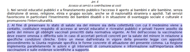 La norma regionale (qui il testo in pdf) stabilisce come requisito d’accesso ai nidi pubblici e privati “l’avere assolto gli obblighi vaccinali prescritti dalla normativa vigente”, e quindi aver somministrato ai minori l’antipolio, l’antidifterica, l’antitetanica e l’antiepatite B.