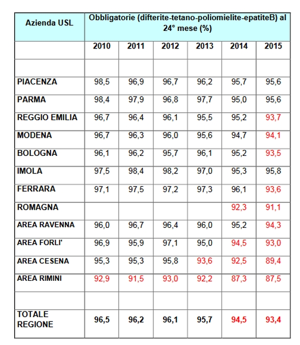 La percentuale di vaccinati che garantisce la migliore protezione a tutta la popolazione deve essere superiore al 95%, limite indicato dall’Organizzazione mondiale della sanità (Oms). In Emilia-Romagna tale copertura è stata del 93,4% nel 2015 dopo essere scesa al di sotto di quella richiesta nel 2014, quando arrivò al 94,5%. Nel 2010 era al 96,5%.