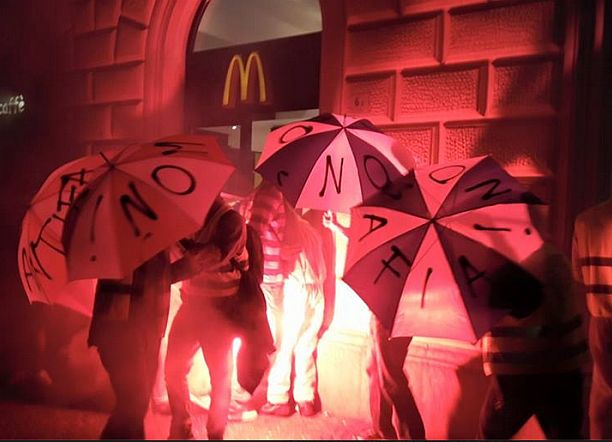 “La street arriva alla stazione centrale. Davanti al McDonald’s viene scaricato del letame, perché il fastfood americano è uno dei partner per la kermesse milanese, altro che cibo di qualità e prodotto sostenibilmente: ‘Expo nutrire il pianeta, energie per le lobbies’. Contemporaneamente si sanziona l’infopoint Expo dentro la stazione”, si legge sul profilo facebook del Tpo di Bologna, centro sociale che ha partecipato alla parata anti-expo.