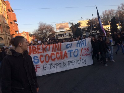 Il corteo in via Rizzoli. “Se non ve ne andate voi, vi cacciamo noi a calci in c…”. È il messaggio senza giri di parole che il corteo degli studenti anti-tornelli ha spedito in direzione di Palazo D’Accursio sede del Comune di Bologna, quando la manifestazione ha sfiorato piazza Maggiore dopo aver superato le Due torri e via Rizzoli. Nel mirino dei contestatori il sindaco Virginio Merola, in compagnia del rettore Francesco Ubertini e del questore Ignazio Coccia. Quando il corteo si è avvicinato al Comune, i mezzi dei Carabinieri schierati in piazza Nettuno si sono allontanati a gran velocità, scatenando l’esultanza dei manifestanti. Alla fine il corteo è ritornato in zona universitaria, da dove è partito.”Stiamo arrivando, rettore stiamo arrivando” è il coro intonato dal corteo nell’avvicinarsi a piazza Verdi da via delle Moline.