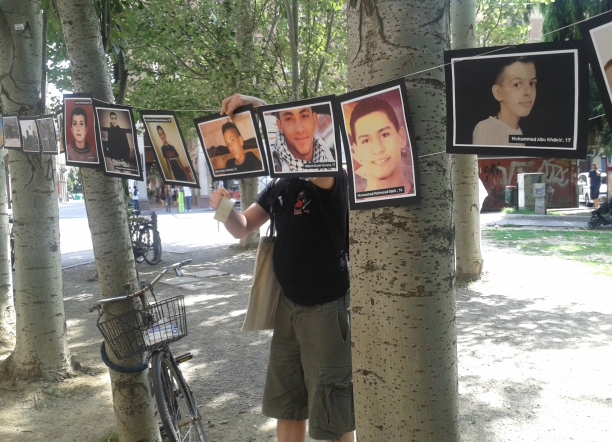 Tra gli alberi appesa una mostra fotografica con i volti di alcuni giovanissimi palestinesi che hanno perso la vita, come Muhammad Abu Khdeir, sequestrato e ucciso a Gerusalemme forse per vendetta e in risposta alla morte dei tre giovani israeliani rapiti tempo fa in Cisgiordania.