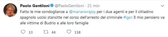 Le condoglianze del presidente del Consiglio Paolo Gentiloni su Twitter.