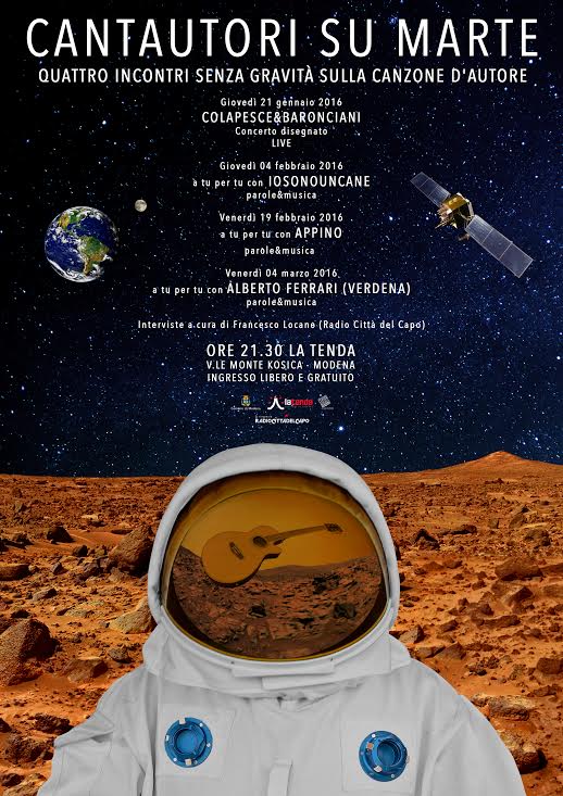 Bologna, 20 dic. – “È una forma a metà tra la poesia e il suono” diceva Fabrizio De Andrè, e si riferiva al lavoro dei cantautori. Ce lo ricorda Corrado Nuccini, ospite ai nostri microfoni per presentare “Cantautori su Marte”, la rassegna che nasce dal progetto in collaborazione col Centro Musica di Modena e che si terrà alla Tenda di Modena con ingresso gratuito.