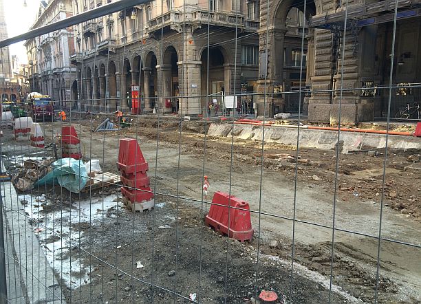 Bologna, 20 feb. – Le ruspe impegnate nei lavori di ripavimentazione di via Rizzoli sono dovute andare più in profondità dei 50-60 centimetri previsti. Chi si è trovato a passare accanto alle reti del cantiere ha potuto vedere che, escludendo gli scavi per i sotto servizi, in molti punti il piano di scavo supera anche gli 80-90 centimetri di profondità. “L’approfondimento è di circa una trentina di centimetri” dice il direttore dei lavori Fabio Monzali che indica nei ritrovamenti archeologici la causa.