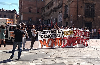 16 giu. – Imponente dispositivo di sicurezza per l’arrivo del presidente del consiglio Mario Monti a Bologna. Tutti gli accessi a via Indipendenza nelle vicinanze dell’Arena del Sole sono chiusi da blindati della polizia e dei carabinieri. Da piazza del Nettuno gli attivisti che hanno raccolto l’invito del centro sociale Tpo si sono messi in marcia verso via Indipendenza, al megafono scandiscono la richiesta di dimissioni del Governo. All’angolo con via Irnerio c’è il colorato cacerolazo del cartello “sMontiamo la crisi” composto da Cua, Crash, Santa Insolvenza, Bartleby, Vag61 e il sindacalismo di base.