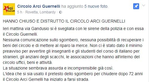 “L’idea che si sia usato il pretesto dello sgombero per chiudere dopo 72 anni il Circolo Arci Guernelli ha iniziato a farsi strada”, si legge. Quando accaduto, secondo i gestori dell’Arci, sarebbe da ricondurre alle prime ore del mattino: l’operazione di sgombero è infatti iniziata alle 6.30 di venerdì 14, per concludersi alle 11.00, e proprio in quelle ore “veniva impedito l’ingresso al Circolo“.