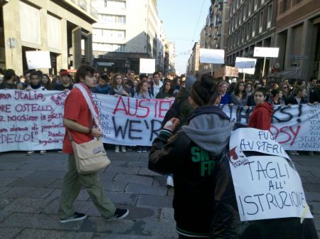 14 nov. – Sono migliaia gli studenti medi e dei collettivi universitari che hanno percorso la città contro le politiche recessive europee. I collettivi hanno sfilato lungo i viali, uova e vernice contro gli uffici del Ministero del lavoro in Viale Masini e poi contro la sede della Cisl, sindacato che non ha aderito allo sciopero. Alcune persone sono entrate nella sede di Via Milazzo con fumogeni, sono state fatte uscire poi dai sindacalisti Cisl. Un “attacco fascista” per il segretario Alberani.