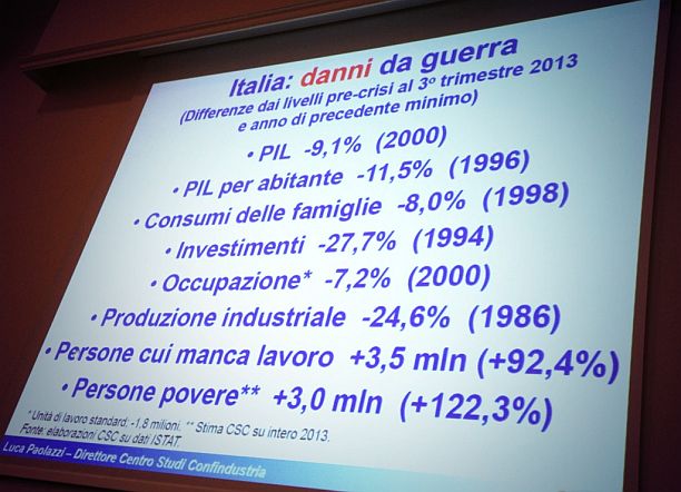 Il direttore del contro studi di Confindustria nazionale, Luca Paolazzi, la crisi di questi ultimi anni è paragonabile, dal punto di vista economico, agli effetti di una guerra.