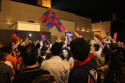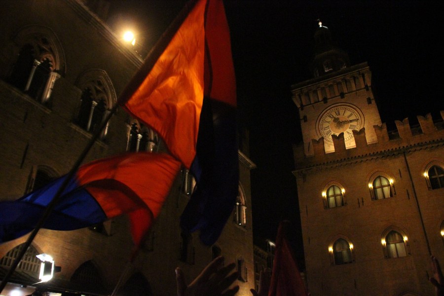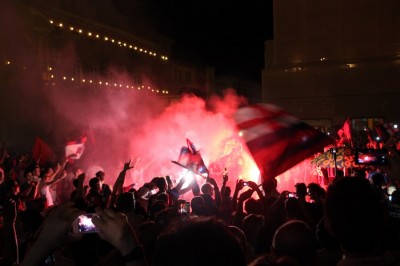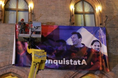 In migliaia hanno riempito piazza Maggiore e dintorni, rimpieti di caroselli in moto o in auto. Bandiere rossoblu, magliette, facce colorate, le immancabili trombette, i petardi e anche qualche razzo lanciato in cielo. Da Palazzo D’Accursio lo striscione “Forza bologna” lascia il posto a quello che recita “#ConquistatA“, secondo l’hashtag usato durante la partita #ConquistiamolA.