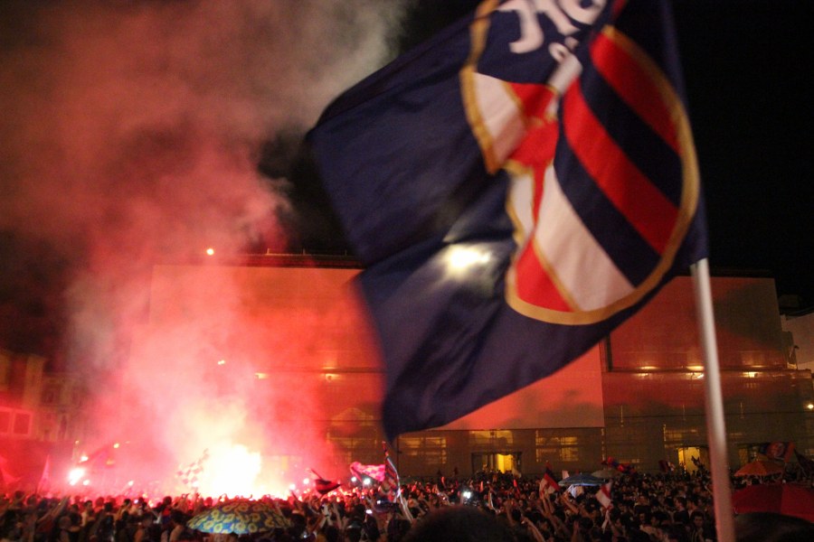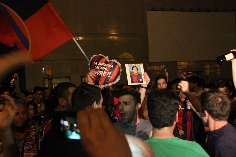 Allo stadio Dall’Ara a guardare la partita c’erano anche gli americani Tacopina e Saputo, atterrati in jet da Montreal per sedersi in tribuna a fianco dell’ex presidente Ferrari Luca di Montezemolo e altre 31mila persone sugli spalti, insieme a politici e musicali, da Fini a Casini al ministro Galletti, da Morandi a Carboni a Cremonini, da Tomba all’arbitro Rizzoli ai bimbi del coro dell’Antoniano per intonare l’inno di Mameli in avvio. In piazza Maggiore tutta la gioia e le attese per le promesse degli americani sulla nuova stagione. In mezzo ai cori, tra cui non ci si risparmia neanche il razzista “Pescarese nomade”, la richiesta alla proprietà è chiara: “Tacopina portaci in Europa”.