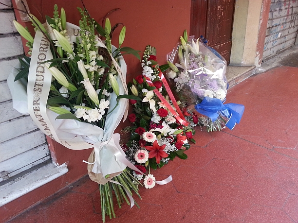 Sotto la targa di Lorusso tre mazzi di fiori: uno dell”Ateneo, uno della Provincia e uno di Lotta continua.