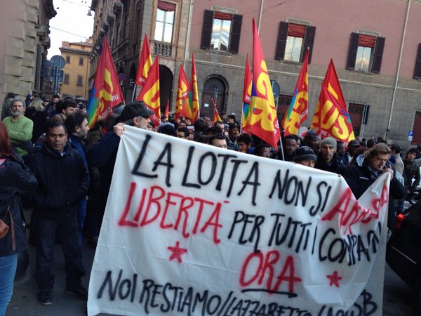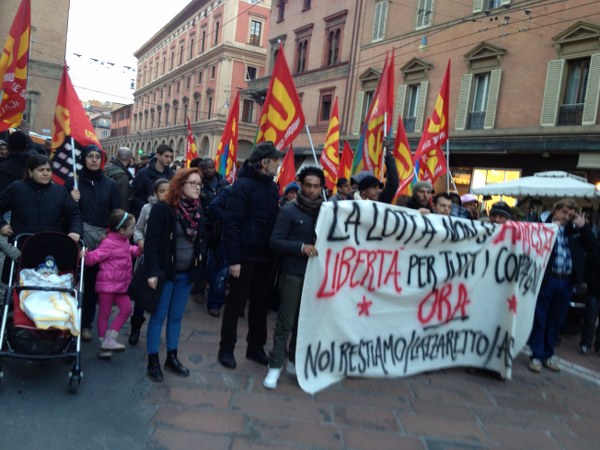 Bologna, 6 mar. – Hanno sfilato in duecento dalla Prefettura fino alla zona universitaria, in solidarietà con 12 attivisti di Cua, Asia e Tpo che hanno ricevuto il provvedimento del Gip Bruno Perla con l’obbligo di dimora all’esterno del territorio comunale di Bologna. Il servizio di Riccardo Tagliati.