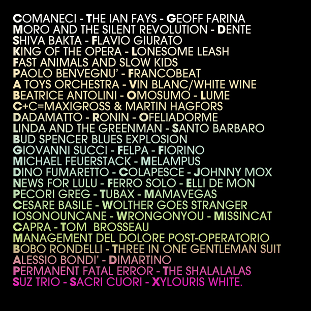 Ecco i musicisti e le band coinvolte nella raccolta: Comaneci – The Ian Fays – Geoff Farina – Moro and the Silent Revolution – Dente – Shiva Bakta – Flavio Giurato – King of the Opera – Lonesome Leash – Fast Animals and Slow Kids – Paolo Benvegnù – Francobeat – A Toys Orchestra – Vin Blanc / White Wine – Beatrice Antolini – Omosumo – Lume – C+C=Maxigross & Martin Hagfors – Dadamatto – Ronin – Ofeliadorme – Linda and the Greenman – Santo Barbaro – Bud Spencer Blues Explosion – Giovanni Succi – Felpa – Fiorino – Michael Feuerstack – Melampus – Dino Fumaretto – Colapesce – Johnny Mox – News for Lulu – Ferro Solo – Elli de Mon – Pecori Greg – Tubax – Mamavegas – Cesare Basile – Wolther Goes Stranger – Iosonouncane – Wrongonyou – Missincat – Capra – Tom Brosseau – Management del Dolore Post-Operatorio – Bobo Rondelli – Three in One Gentleman Suit – Alessio Bondì – Dimartino – Permanent Fatal Error – The Shalalalas – Suz Trio – Sacri Cuori – Xylouris White