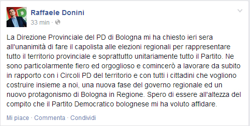 “La Direzione Provinciale del PD di Bologna mi ha chiesto ieri sera all’unanimità di fare il capolista alle elezioni regionali per rappresentare tutto il territorio provinciale e soprattutto unitariamente tutto il Partito” scrive Donini che prosegue: “Ne sono particolarmente fiero ed orgoglioso e comincerò a lavorare da subito in rapporto con i Circoli Pd del territorio e con tutti i cittadini che vogliono costruire insieme a noi, una nuova fase del governo regionale ed un nuovo protagonismo di Bologna in Regione. Spero di essere all’altezza del compito che il Partito Democratico bolognese mi ha voluto affidare”.