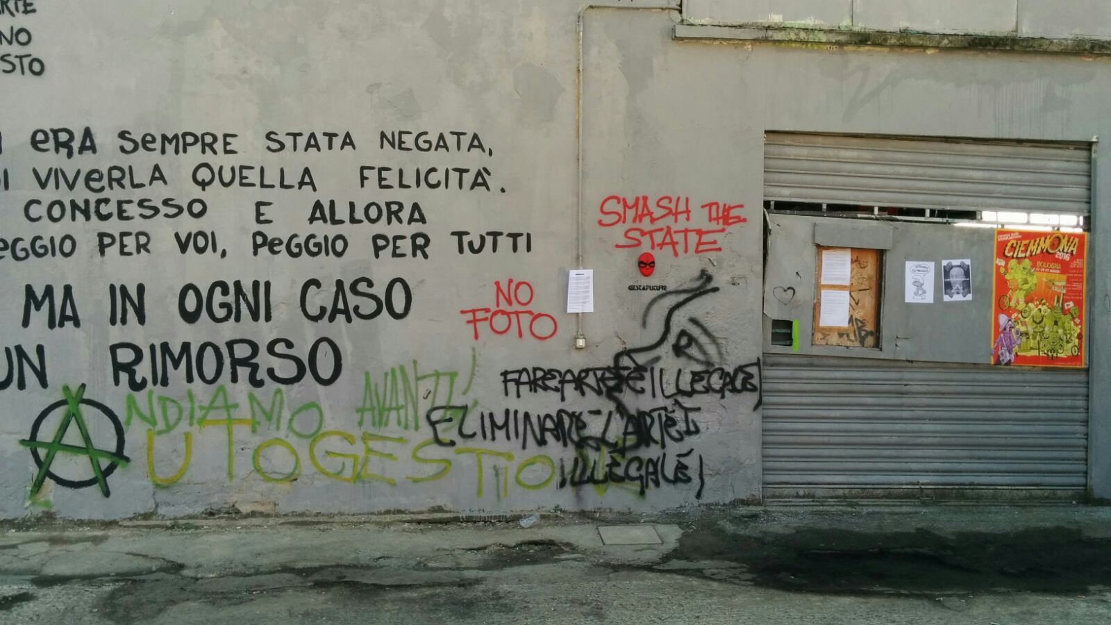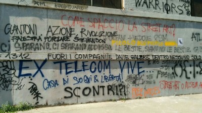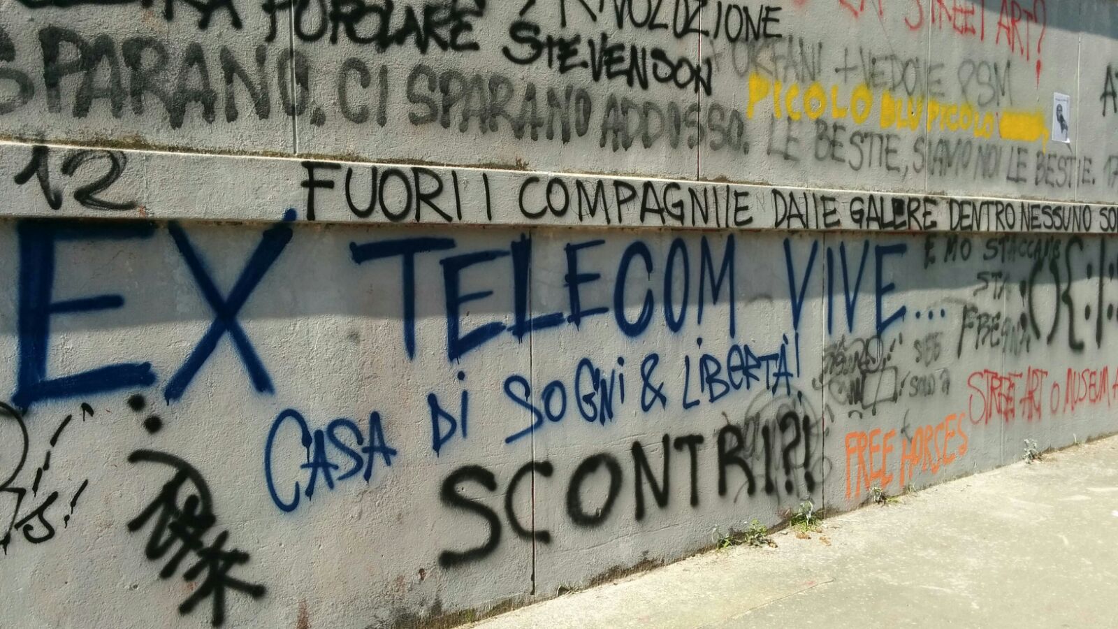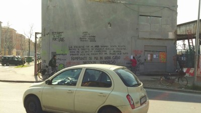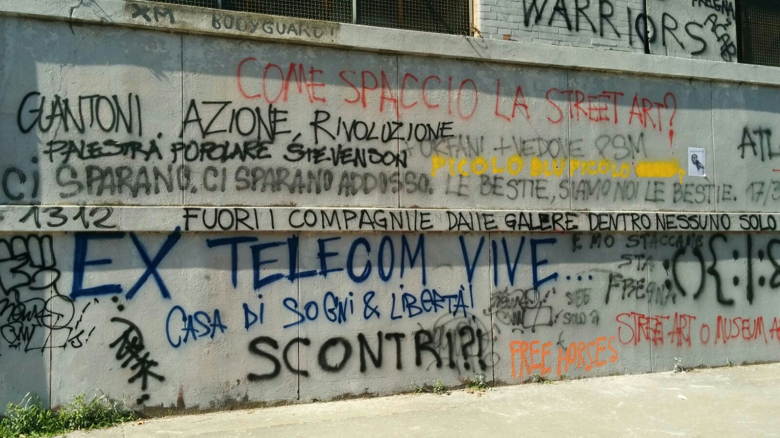 Bologna, 18 mar. – Dopo le pennellate di Blu, il grigio che ha ricoperto Xm24 è stato spazzato via da una miriade di scritte. E’ successo ieri sera, durante la serata benefit per raccogliere fondi a favore dei tre attivisti denunciati per imbrattamento sabato scorso, durante le operazioni che hanno portato alla cancellazione dell’elefante giallo di via Zanardi.