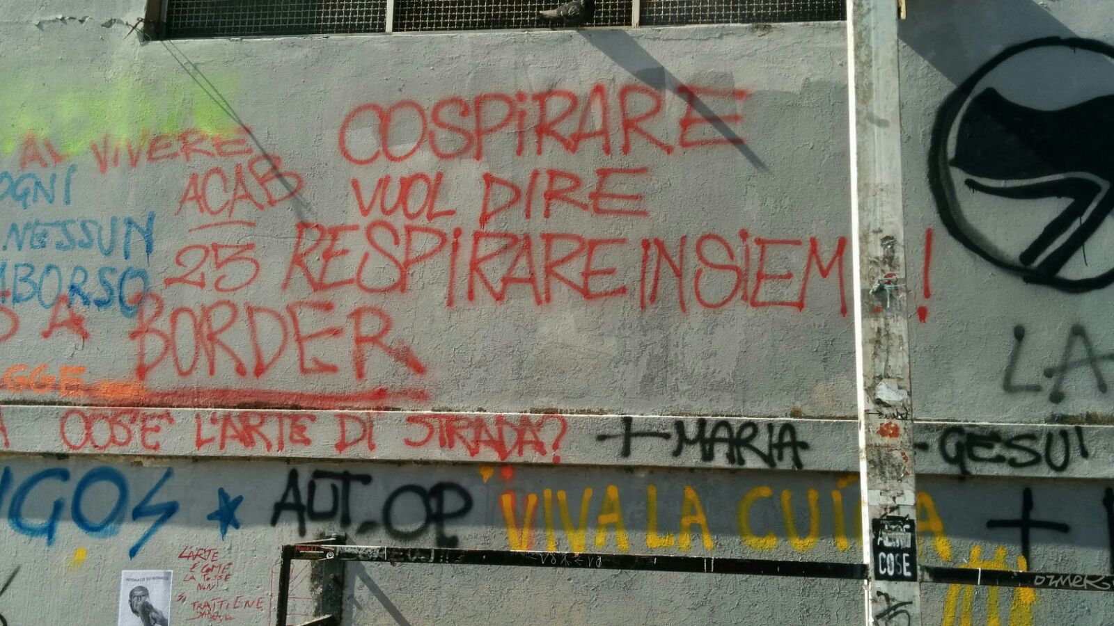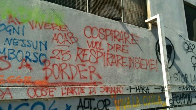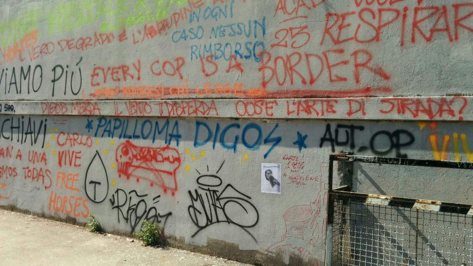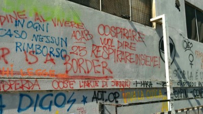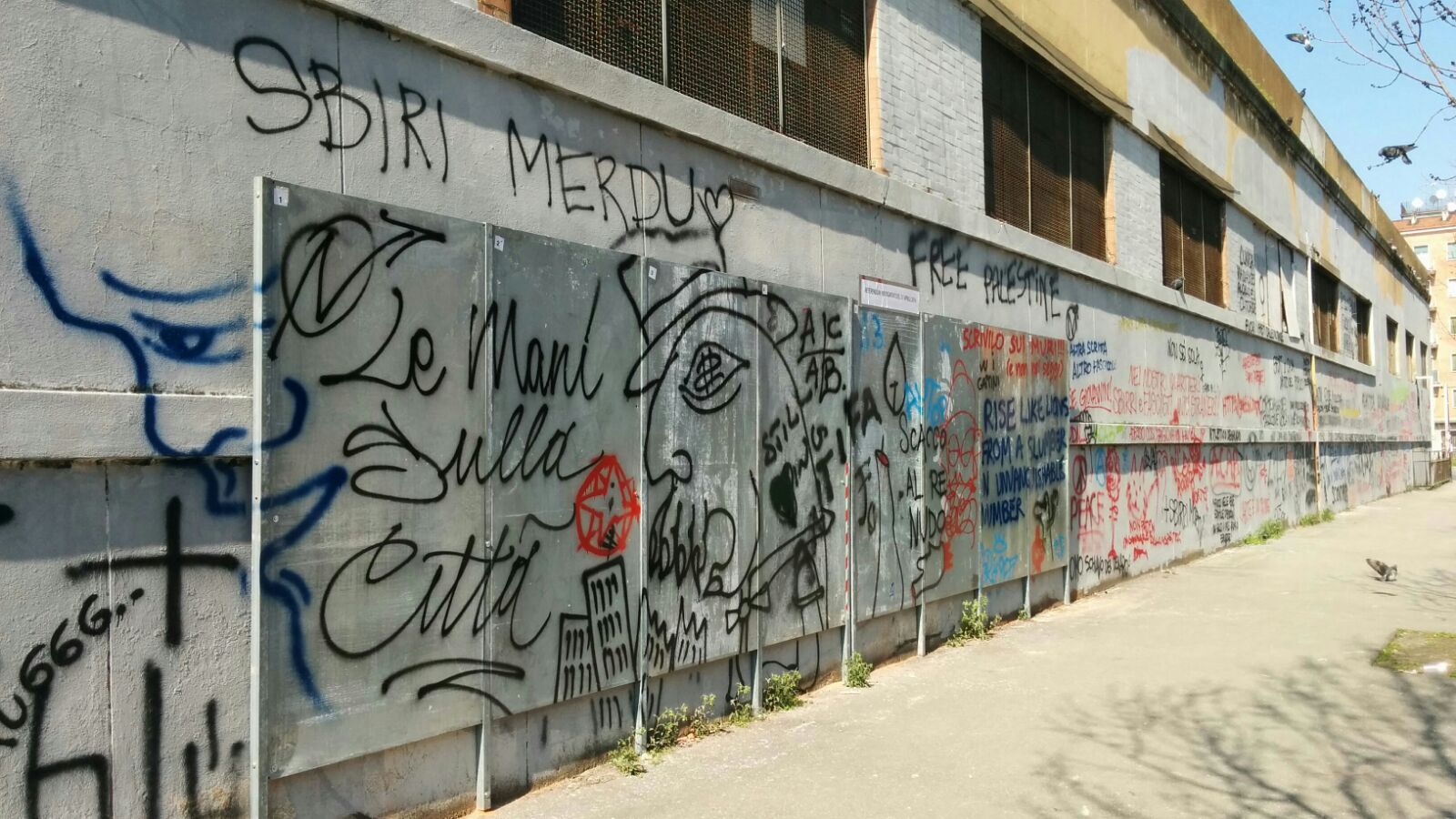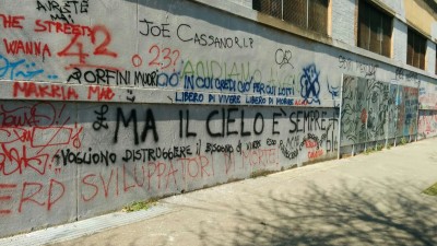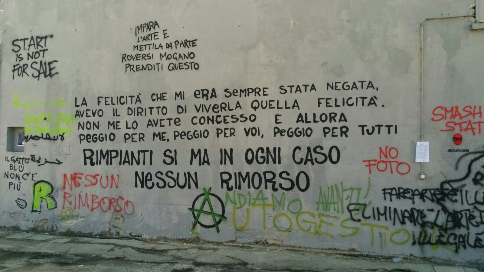 Bologna, 18 mar. – Dopo le pennellate di Blu, il grigio che ha ricoperto Xm24 è stato spazzato via da una miriade di scritte. E’ successo ieri sera, durante la serata benefit per raccogliere fondi a favore dei tre attivisti denunciati per imbrattamento sabato scorso, durante le operazioni che hanno portato alla cancellazione dell’elefante giallo di via Zanardi.