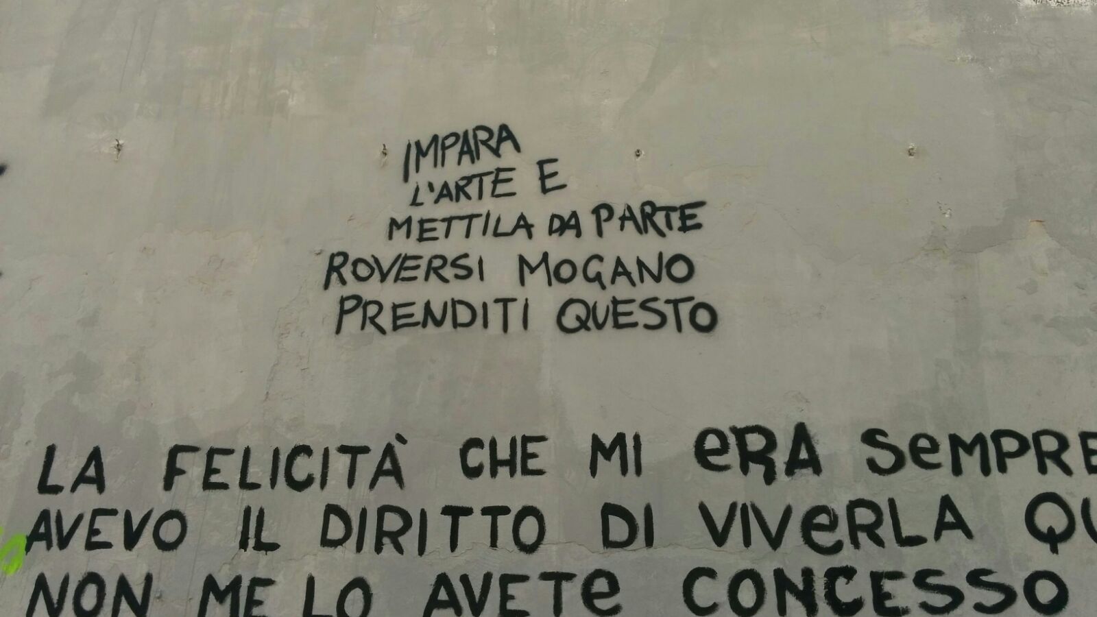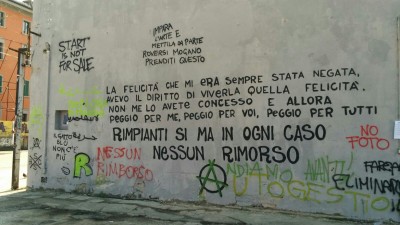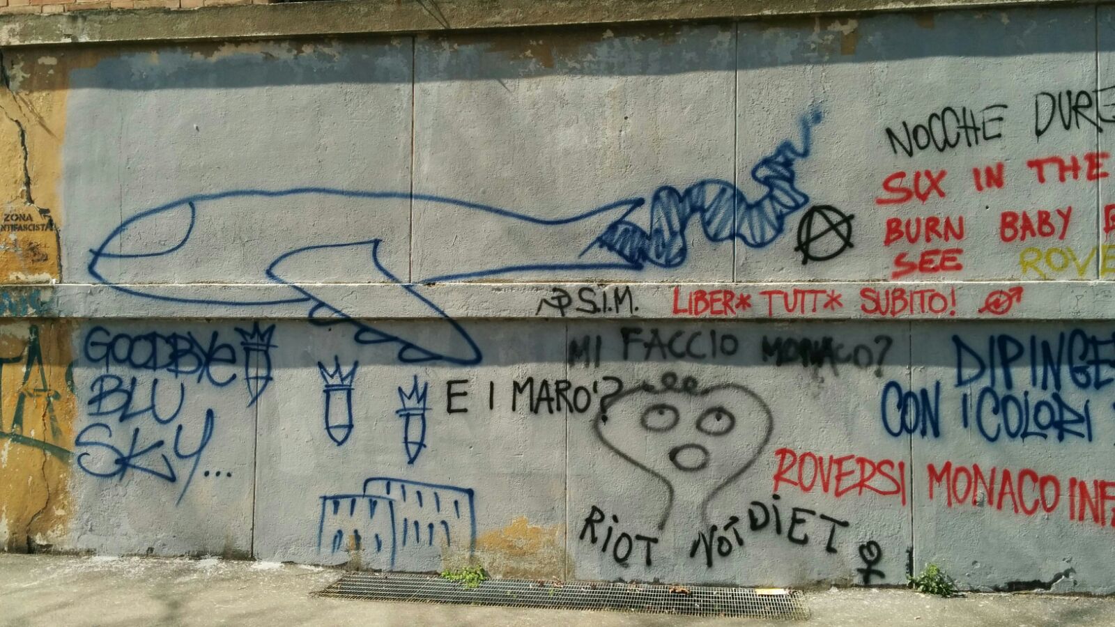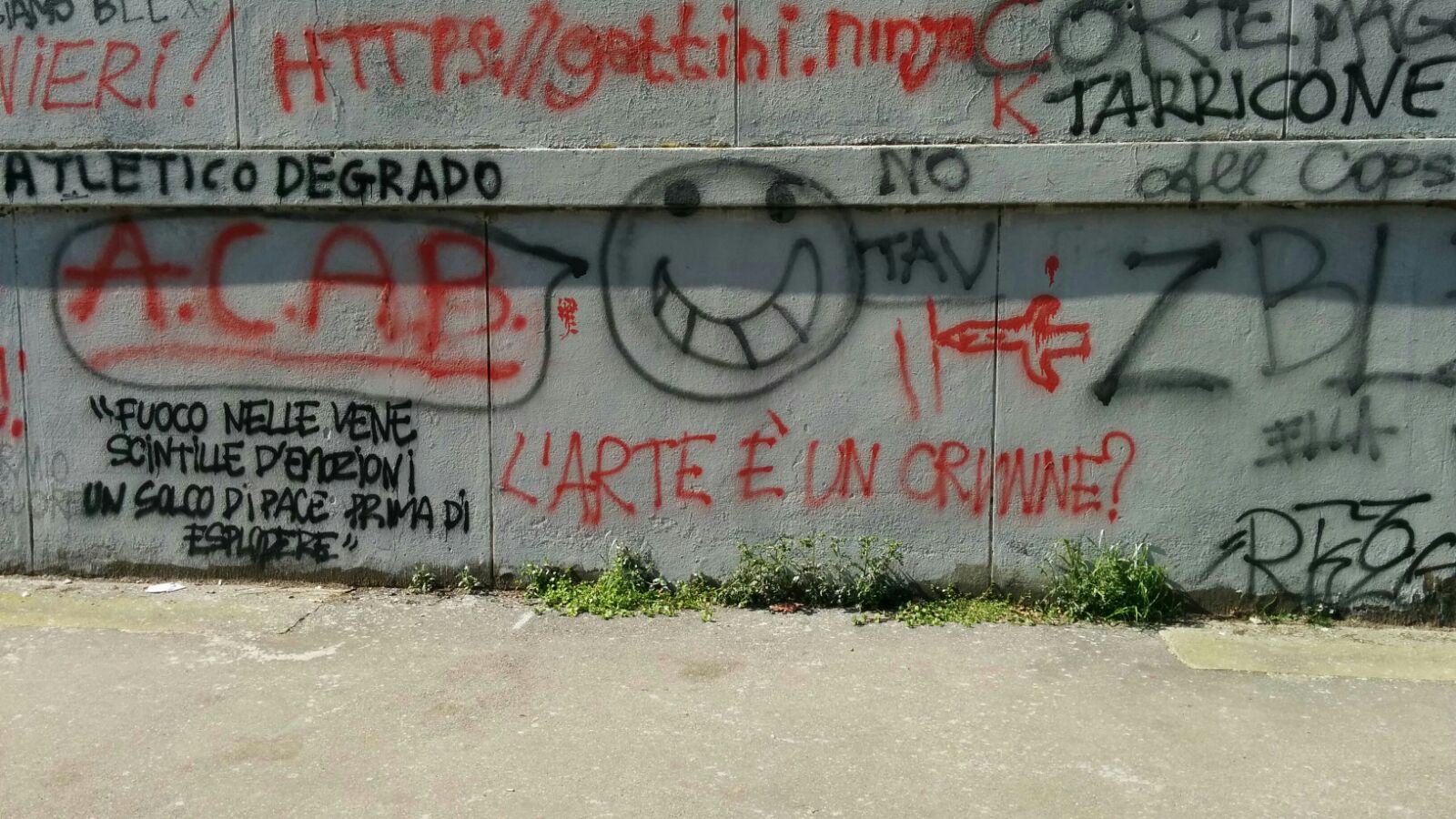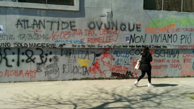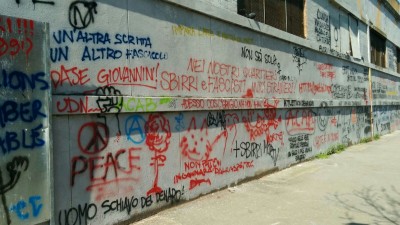 Bologna, 18 mar. – Dopo le pennellate di Blu, il grigio che ha ricoperto Xm24 è stato spazzato via da una miriade di scritte. E’ successo ieri sera, durante la serata benefit per raccogliere fondi a favore dei tre attivisti denunciati per imbrattamento sabato scorso, durante le operazioni che hanno portato alla cancellazione dell’elefante giallo di via Zanardi.