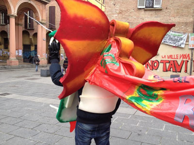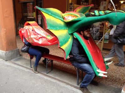 E’ un Drago educato e saluta i passanti di piazza Verdi. Al Drago piace ballare e sa che al Bentivoglio Club sabato sera ci sarà la festa clou della campagna abbonamenti, Tinto Meglio.