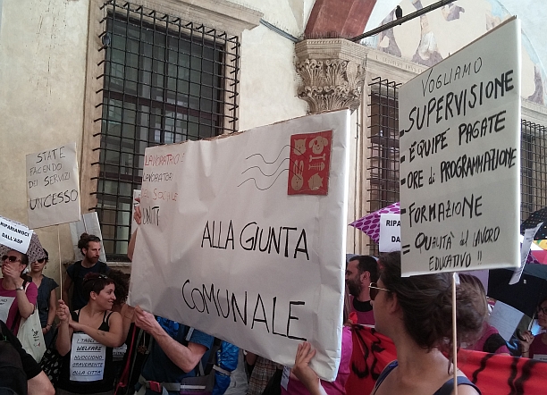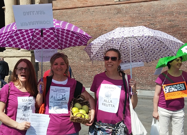 Rivendicano salari più alti e continuità di reddito nei mesi estivi e poi chiedono a gran voce di fermare i tagli ai servizi sociali. Sono educatori, assistenti sociali, operatori dei servizi sociali, precari e non. Insieme a loro protestano anche le educatrici degli asili nido e delle scuole dell’infanzia di fronte all’ipotesi di servizi con orari più flessibili, ed eventualmente aperti anche nel fine settimana, come dichiarato dalla vicepresidente regionale Elisabetta Gualmini. “No a scuole e nidi parcheggio, sì a luoghi educativi” questo lo striscione portato in corteo dalle educatrici. “Siamo molto preoccupate, perché il nido è un luogo educativo – ha detto Giuliana, educatrice di asilo nido – I bambini hanno diritto a passare tempo in famiglia e in tranquillità. Non può ricadere su di loro la scelta dei ritmi competitivi di questa società. E poi si creano problemi organizzativi difficili da gestire”.