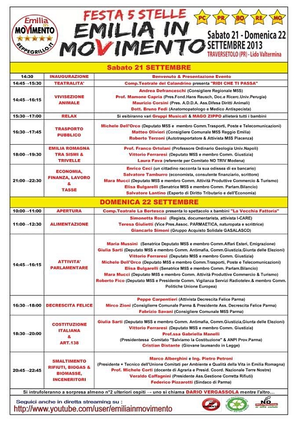21 sett. – Si chiama Emilia in Movimento ed è la prima festa interprovinciale del Movimento a 5 Stelle dell’Emilia. Una due giorni (sabato 21 e domenica 22 settembre) che vedrà susseguirsi dibattiti e convegni sui temi cari ai 5 Stelle. Decrescita felice, ecologia (si parlerà di biogas e inceneritori), economia, Costituzione e alimentazione. L’evento si terrà a Traversetolo, in provincia di Parma.