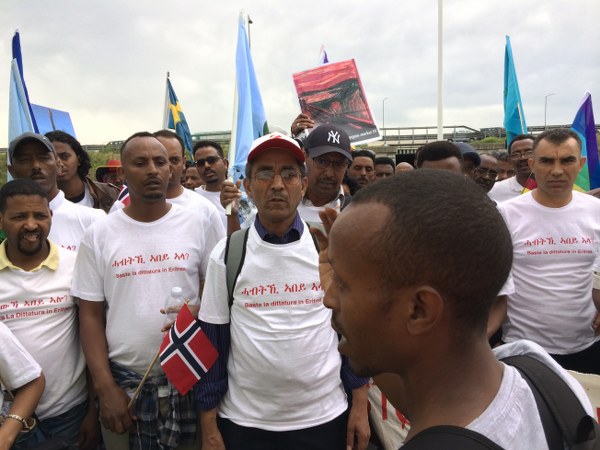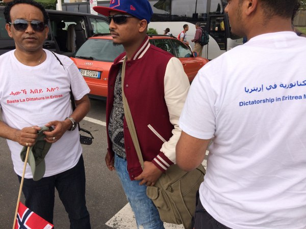 I manifestanti eritrei indossano magliette bianche con sopra alcune scritte. Una è scritta in italiano, inglese e arabo e recita “Basta la dittatura in Eritrea”. L’altra, la prima, è scritta in tigrino, la lingua più parlata in Eritrea, e si conclude con un punto interrogativo. “Dov’è tuo fratello”: è rivolta alle persone dall’altra parte della recinzione, quelle dentro il festival: “Vogliamo mostrare loro che si può uscire dalla gabbia costruita dal regime” dicono i manifestanti.