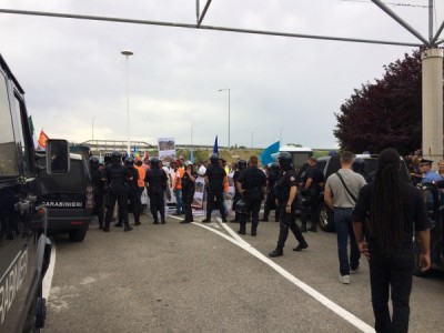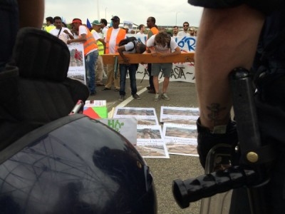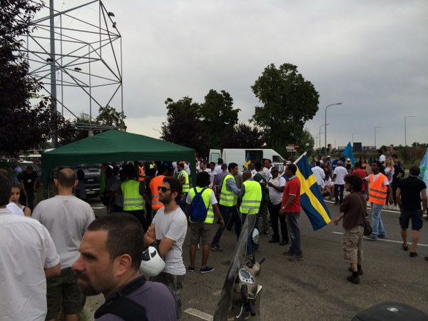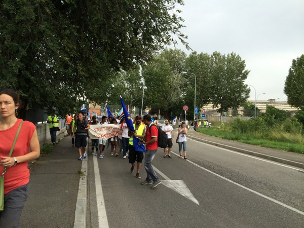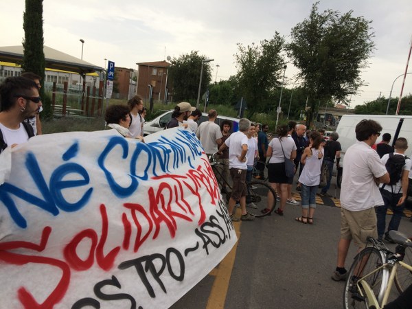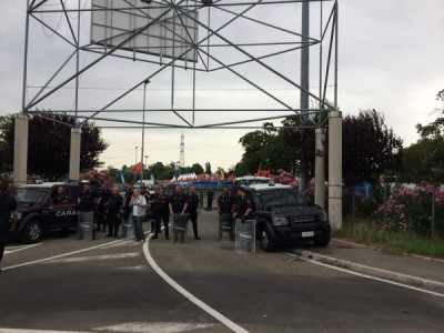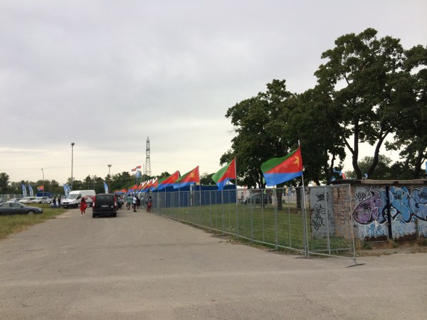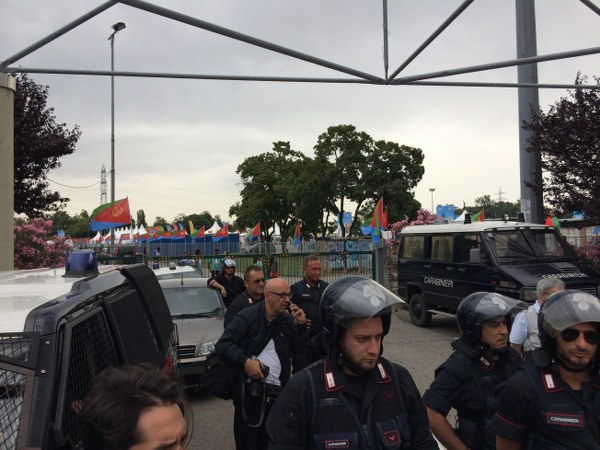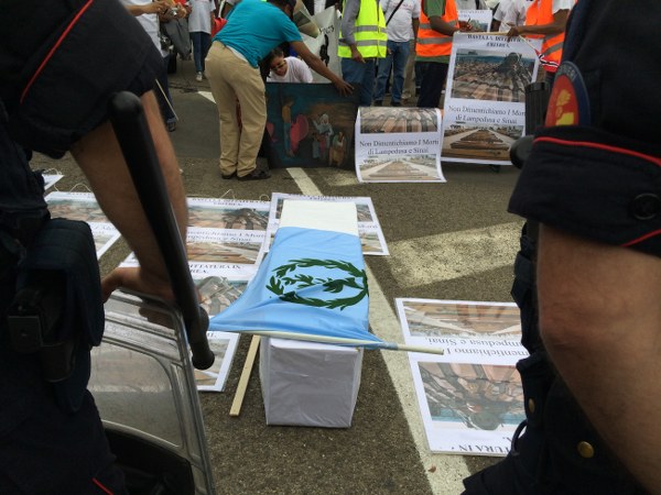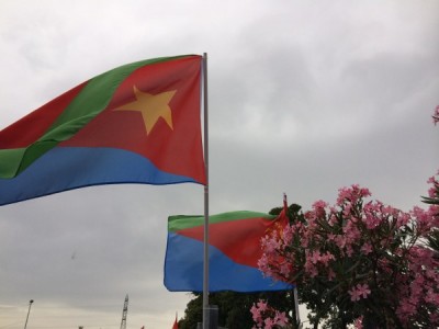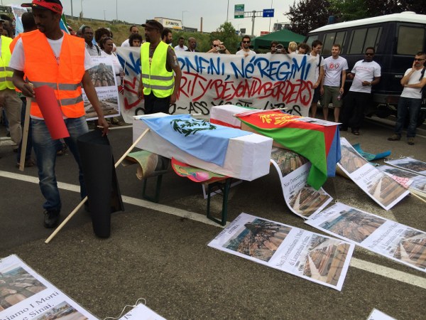 Da cui l’accusa dei manifestanti al festival: “State ballando sui morti di Lampedusa” dicono mentre in presidio, davanti all’ingresso del Parco Nord che dà verso la Fiera, depositano due finte bare davanti allo schieramento di Carabinieri in tenuta antisommossa. Con loro ci sono anche alcune decine di attivisti dei centri sociali Tpo, Làbas e Xm24. Tante bandiere, degli stati europei, dell’Europa, della Pace e anche vecchie bandiere eritree azzurre con al centro un ulivo in verde. “Era la bandiera prima dell’indipendenza” spiega una manifestante. “Vedi – aggiunge – l’ulivo è lo stesso simbolo che Afewerki ha messo nella nuova bandiera dell’Eritrea, quella riconosciuta dall’Onu. In realtà – spiega – quella è la bandiera del Fronte a cui ha sostituito la stella con l’ulivo”. Mentre parla indica le bandiere issate dentro l’area del festival: righe orizzontali verde e azzurra coperte da un triangolo rosso in cui spicca, alternativamente, l’ulivo e la stella. “In Eritrea c’è un partito unico – raccontano i manifestanti – il presidente nel 2001 ha fatto arrestare 15 ministri e di loro non si sa più nulla”.