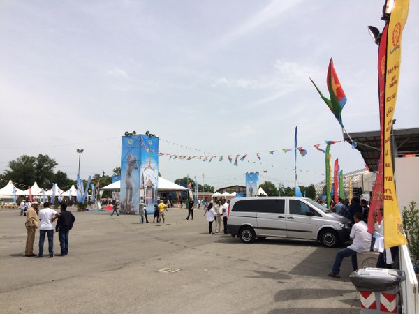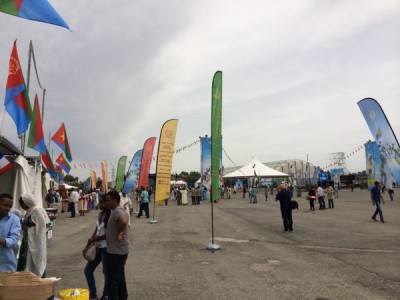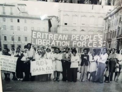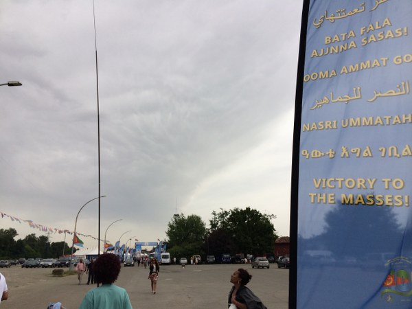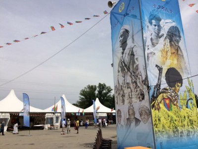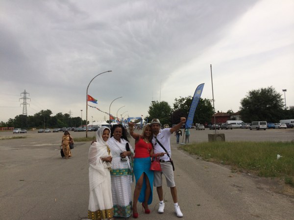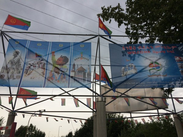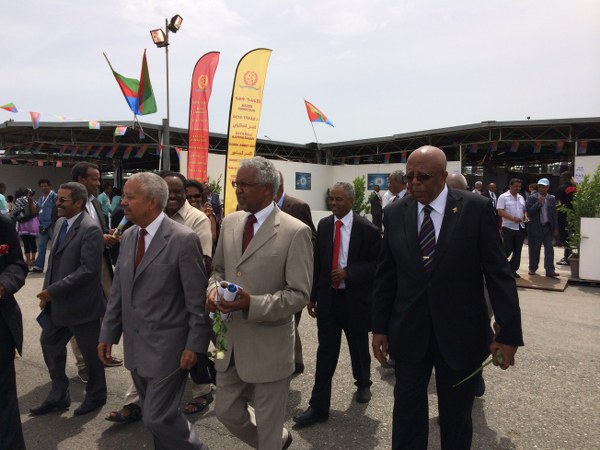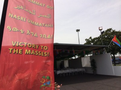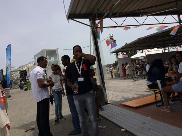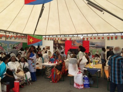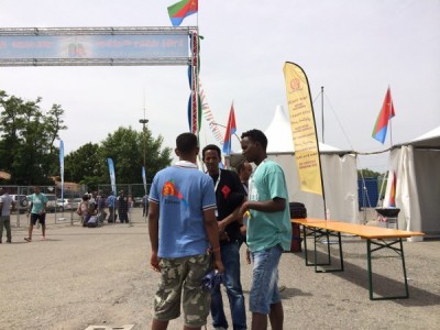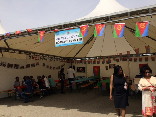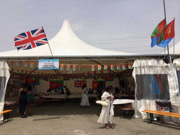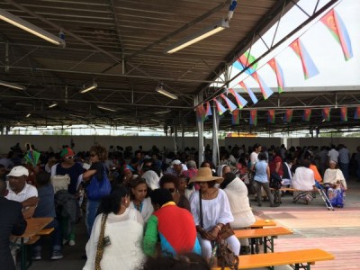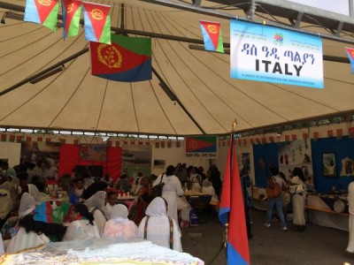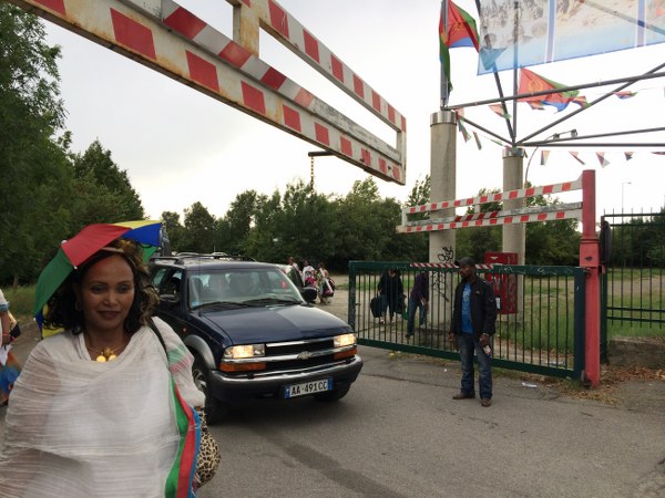 Nell’area della festa ci sono circa un migliaio di persone. Una decina i pullman con targa tedesca parcheggiati tra la prima e la seconda recinzione. Molte le auto, la maggior parte con targa italiana ma tante anche quelle tedesche e inglesi. L’afflusso è costante e continuo: gente che entra e gente che esce. Le donne, soprattutto quelle anziane, indossano gli abiti tradizionali. Sull’area sventolano le bandiere dell’Eritrea, alternate sui pennoni a quelle del Fronte di Liberazione del Popolo Eritreo. A completare la coreografia ci sono le vele azzurre, gialle, rosse e verdi (i colori della bandiera eritrea) con lo slogan “Victory to the masses”, scritto in molte lingue.
